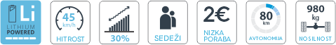 | Teža vozila | 875 kg (z Litij baterijami) |
